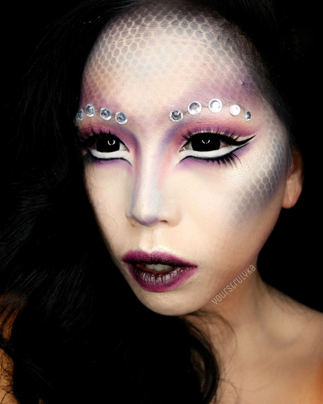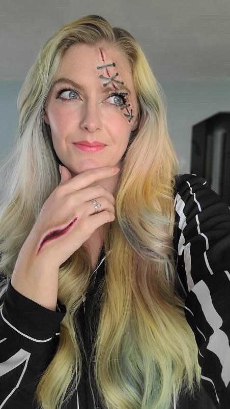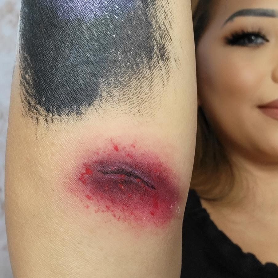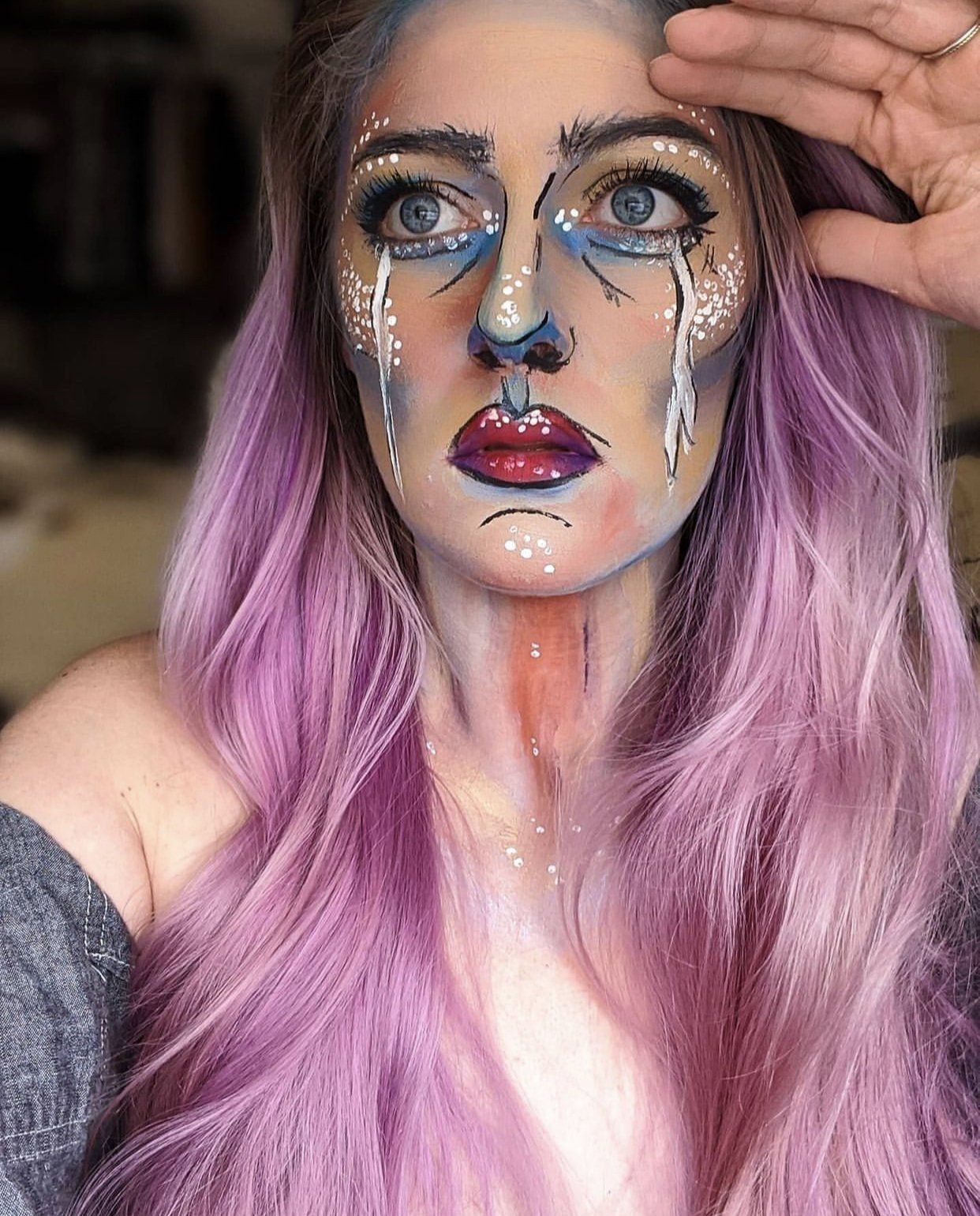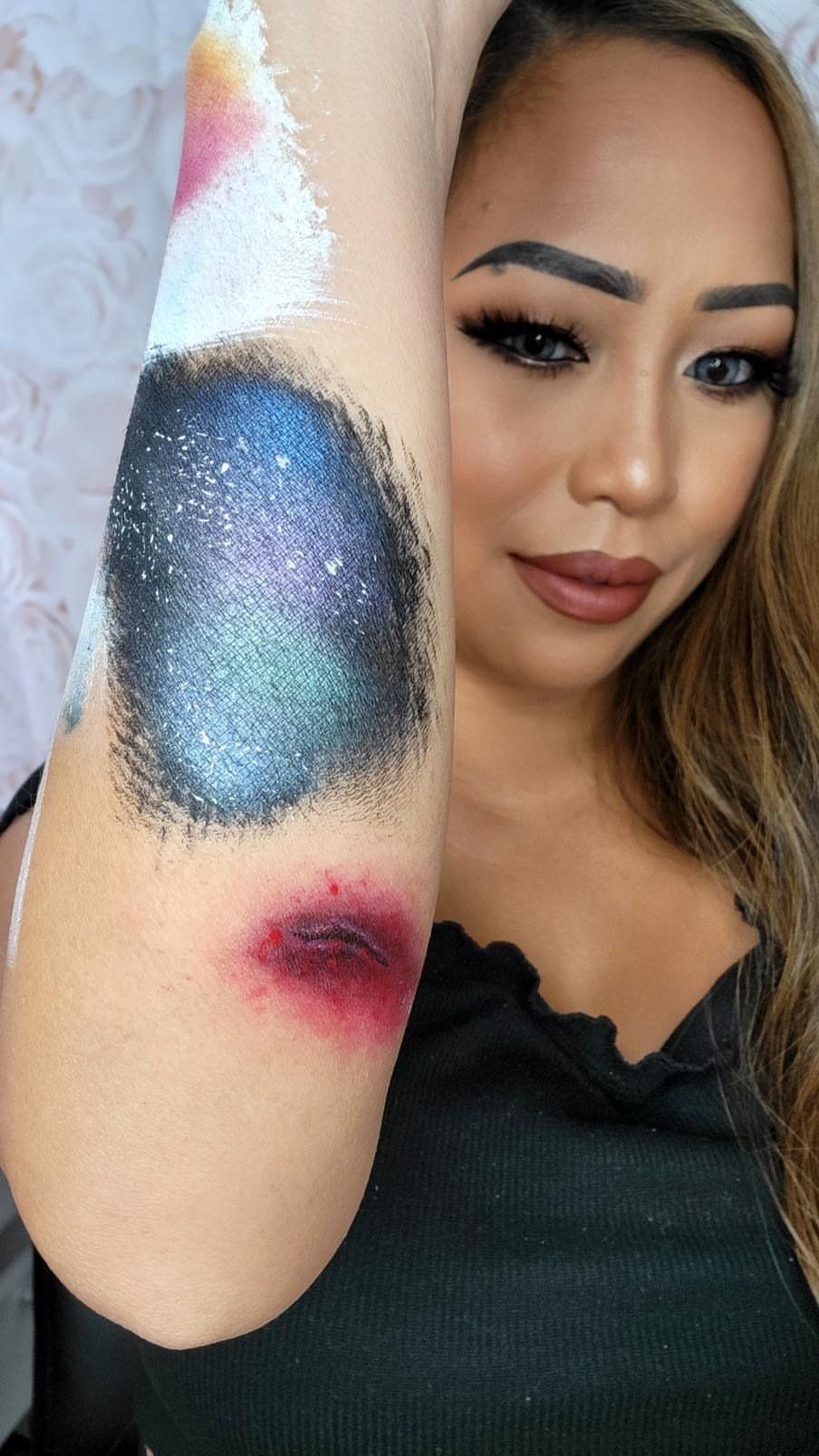 Ka shared how to use white custom blend as a base and then applied eye shadows on top. She then created a "galaxy" using a black base along with a very realistic cut using eyeliner and lip stick.